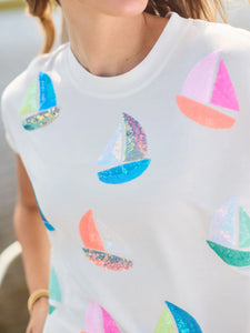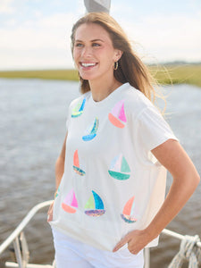 Set sail in style with the Emily Top. Featuring sequin embroidered sailboats, this top brings a touch of nautical charm to your wardrobe. Its relaxed fit makes it ideal for laid-back days when you want to add a fun, coastal touch to your look.