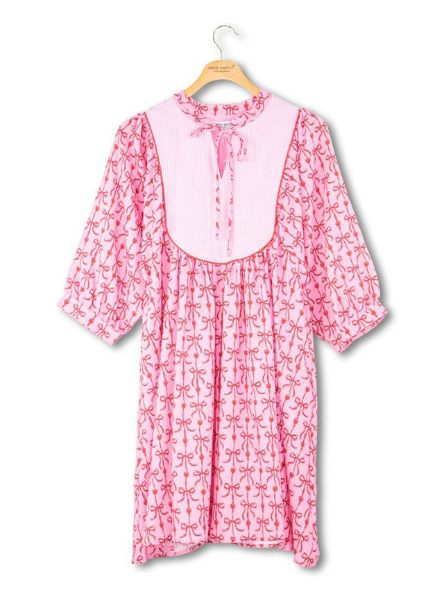 The Yoke Dress features a yoke with complimentary pink and red prints, a tie neckline, puff sleeves, a ruffled collar, yoke construction, and pockets. Made of 100% polyester.